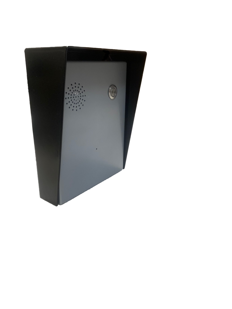 Interfono VoIP, con 1 pulsador, basado en la placa I-401P, sobre una caja de aluminio pintado para alojarse sobre pared. Sus dimensiones aproximadas son 168x133x35mm.